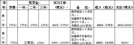 3. 实习工资:月薪约1150欧元。两年可实习10-15个月。最多可获实习工资17250欧元。