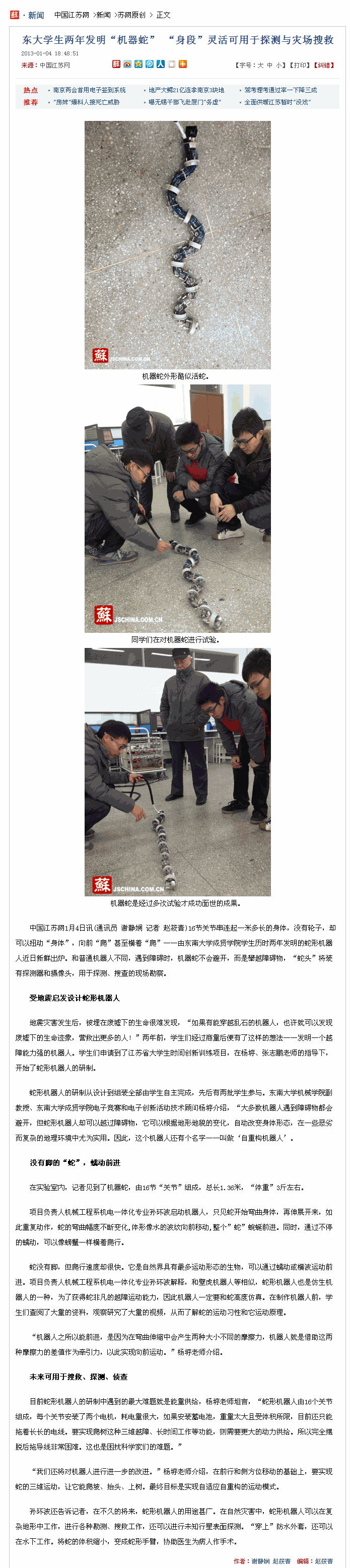 【中国江苏网】两年发明“机器蛇”,“身段”灵活可用于探测与灾场搜救