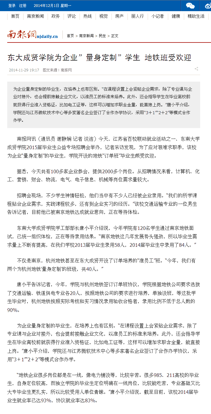 【南京日报】东大成贤学院为企业”量身定制”学生 地铁班受欢迎
