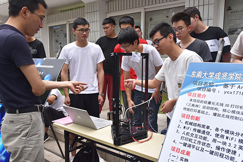 展示会上,参展的项目组成员在指定区域以展板介绍、实物演示等方式,展示了项目研究成果,并对项目创新点、研究思路、成果应用价值等进行了分析与讲解,吸引了众多师生驻足观看。其中,《基于Raspberry Pi与Arduino的智能家居电器控制系统》《分子印迹催化剂在有机反应中的应用研究》《中车南京海泰新基地三维宣传影片》更是以其丰富的创意与大胆的创新赢得了掌声与肯定。