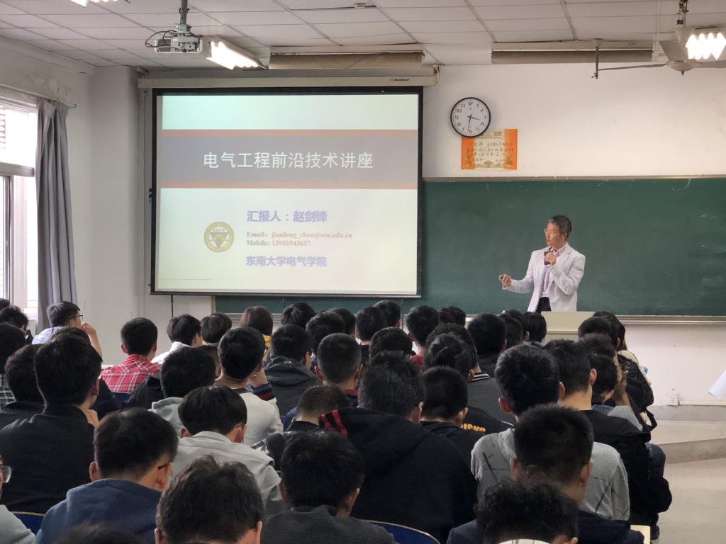 赵教授围绕“电气工程学科发展”,从学科发展介绍、学科发展动力、学科发展趋势三个方面展开讲座,给同学们介绍了电力技术重点研究方向,智能输电技术、可再生能源发电技术、电能质量管理、无线充电技术、材料进步与电力电子器件的发展、城市能源互联网构想等学科前沿问题和关键技术。