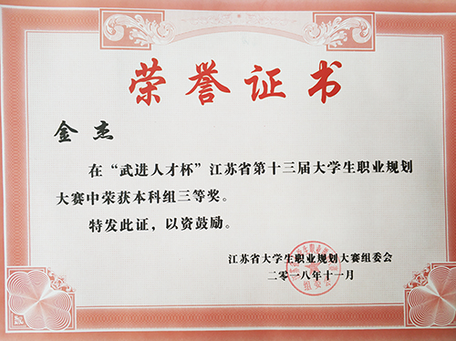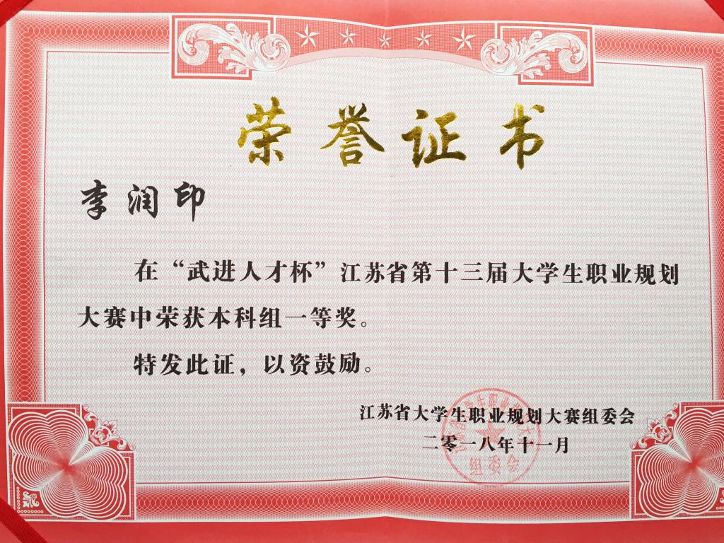 江苏省大学生职业生涯规划大赛由江苏省教育厅主办、江苏省高校招生就业指导服务中心承办。大赛自2006年启动以来历经十三届,今年的大赛规模再创新高,共有全省140所高校14余万名大学生参赛, 484名选手进入省复赛,最终30名选手晋级本科组总决赛。在校领导与学生处、教务处、团委等相关部门的关心支持下,在指导老师的帮助下,制药与化学工程学院李润印以绿色化工OTS项目工程师为职业目标,将职业理想完美呈献,展现了成贤学子积极向上、脚踏实地追求梦想的青春风采,最终晋级总决赛并获一等奖。