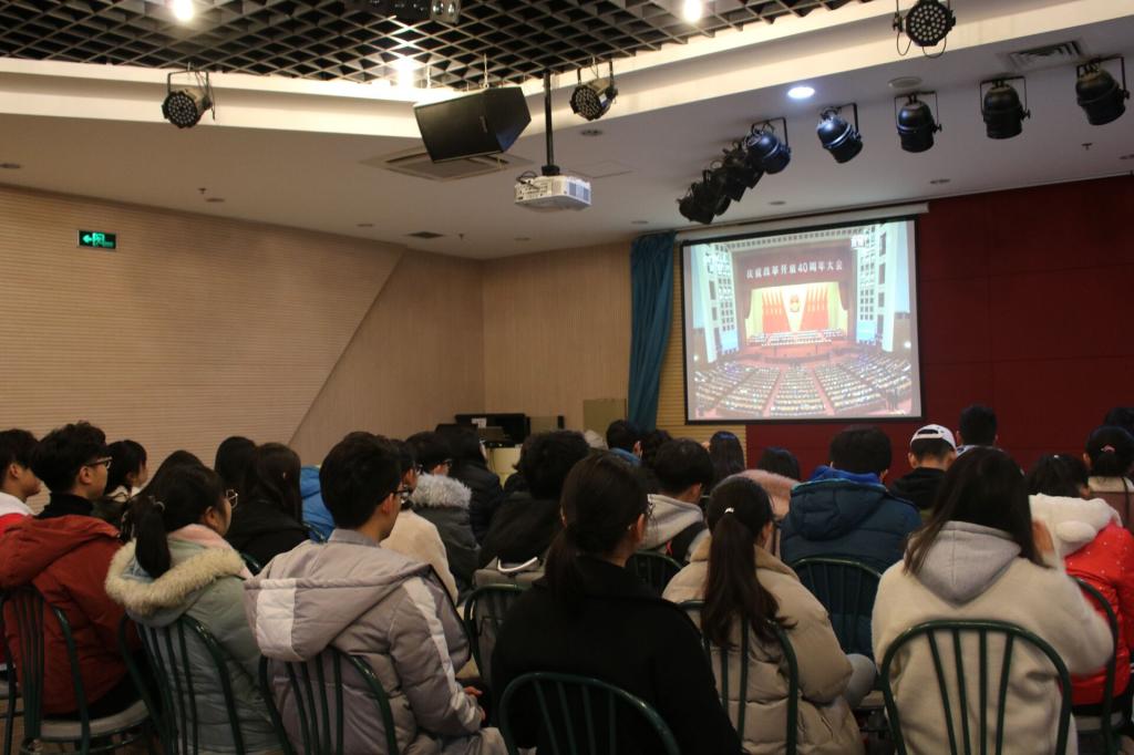 在真知馆报告厅内,学院党政领导和全体教职员工集中观看了直播盛况。校团委组织100多位学生干部在综合楼多功能厅进行了集中观看。师生们还通过手机、电脑直播等方式观看了大会实况。