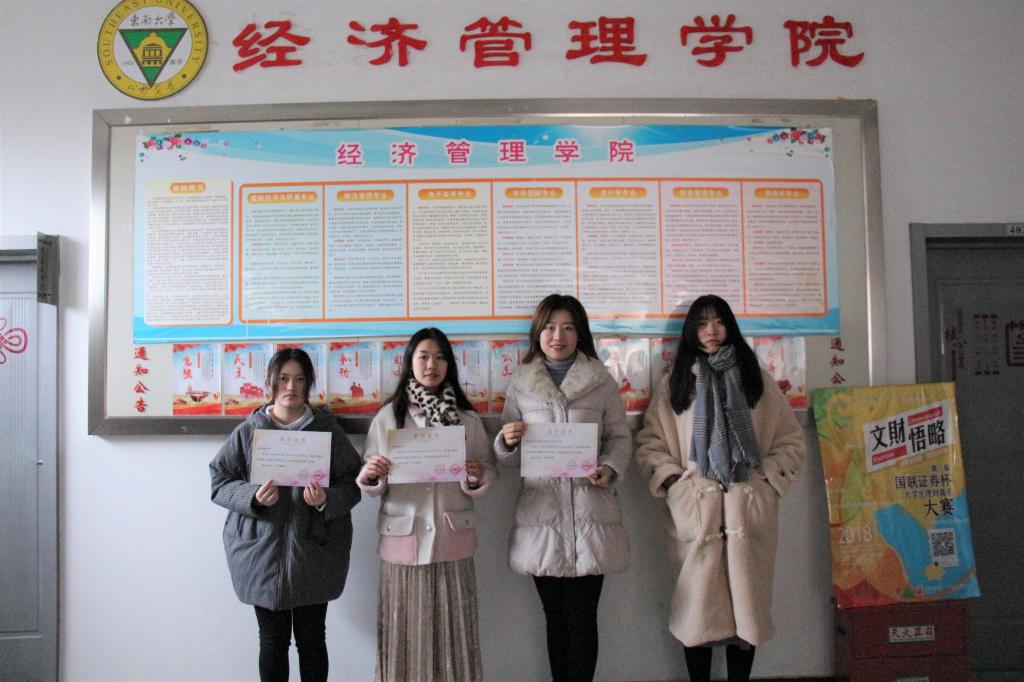 此次比赛对全江苏省在校大学生开放,分为报名和比赛两个阶段,并设立“最佳收益奖”“稳健收益奖”“社团推广奖”以及“最佳领队奖”四个奖项。为积极响应校团委的号召,经济管理学院分团委对此次比赛大力宣传,KY开元共有750名学生参赛。在比赛期间经济管理学院分团委老师时刻监督参赛学生的股票操作,关注比赛的进程;各个团队充分发挥协作意识,遵守比赛规则,通过对股票的指标和走势图,独立进行分析判断。经过近一个月的激烈比赛,KY开元安舒琪、聂详毅同学获得“最佳收益奖”优秀奖,吕诗颖同学获得“稳健收益奖”二等奖,潘天娇老师荣获“最佳领队奖”,KY开元经济管理学院获得“社团推广奖”二等奖。