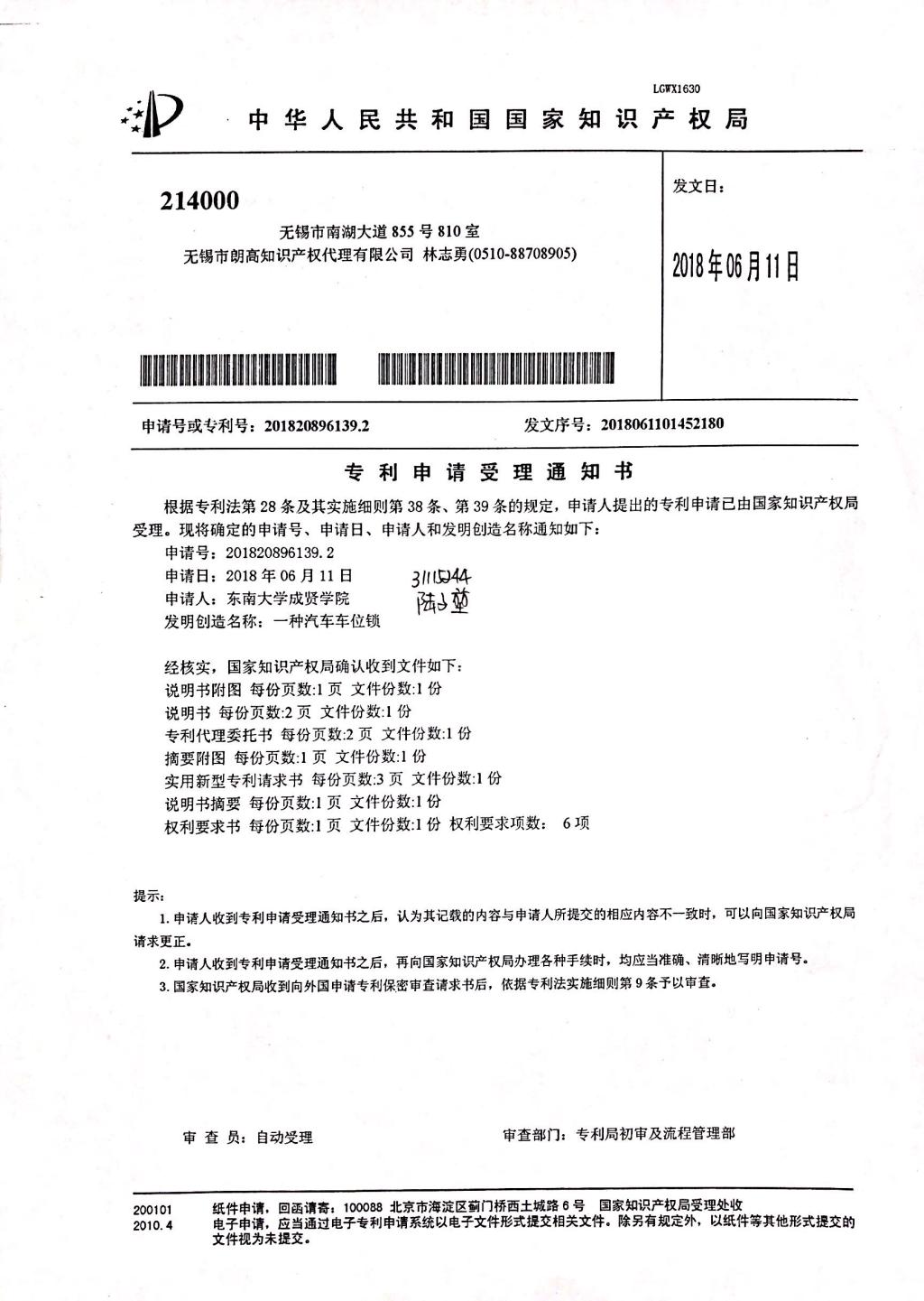 国家实用新型专利为智能车位锁(专利号201820896139.2),发明人:丁苍璧、陆子堃、殷若宬。该车位锁采用新能源供电,将太阳能与直流电有效结合,通过红外测距检测到车辆入库,交由单片机读取车牌数据,与系统中预先储存的车牌进行比对(判断入库车辆身份),当车位中停留的车辆离开时,红外测距装置将会检测到距离的突变,此时判断车辆已经离开,在短暂延时后,将挡板升起,将车位锁住。