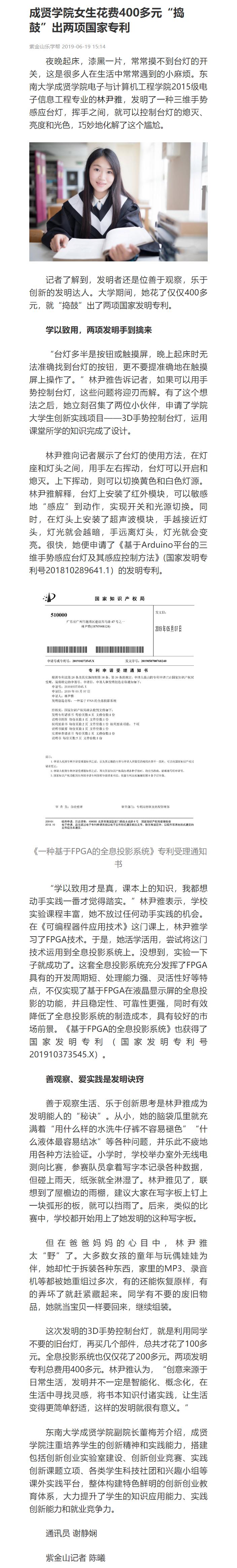 【紫金山新闻】成贤学院女生花费400多元“捣鼓”出两项国家专利