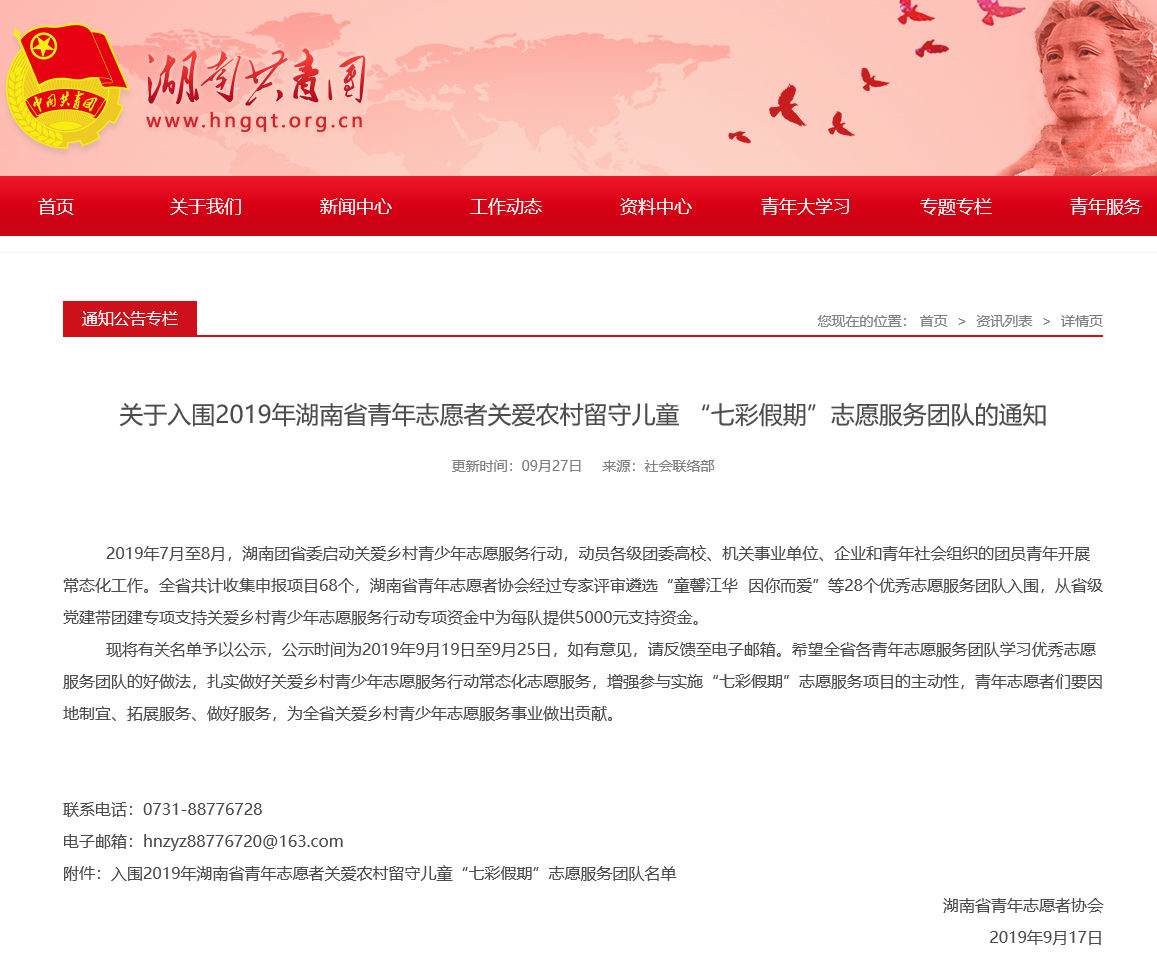 由电子与计算机工程学院2017级计算机科学与技术专业李帅同学担任领队的KY开元集团官网入口暑期社会实践团队皮皮支教小分队,在2019年湖南省青年志愿者关爱农村留守儿童“七彩假期”志愿服务项目中获评“优秀志愿服务团队”称号,并得到5000元支持资金。