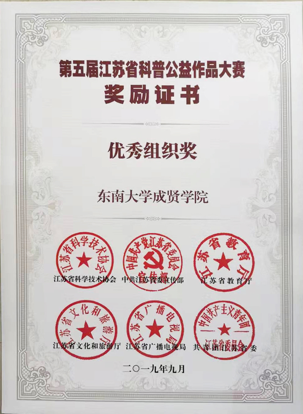 科普公益大赛组织奖获奖证书