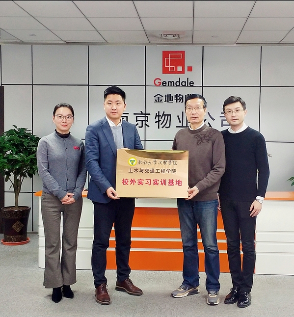 1月2日,土木与交通工程学院常务副院长郭应征,院长助理、综合办主任石城前往金地物业管理集团南京物业公司进行座谈交流,并与该公司签订合作协议,举行了“校外实习实训基地”挂牌仪式。