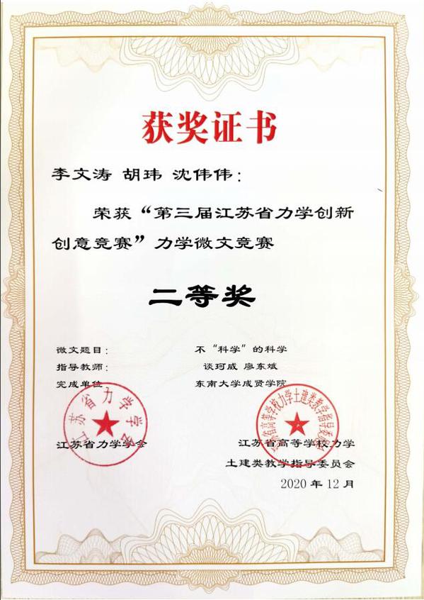 “第三届江苏省力学创新创意竞赛”是由江苏省力学学会和江苏省高等学校力学土建类教学指导委员会联合主办,为提高我省高校学生的力学素养和综合素质,增进学习力学的兴趣、培养分析解决实际问题的能力,发现力学创新人才,所开展的一项重要赛事。比赛吸引了南京航空航天大学、河海大学、南京工业大学等省内知名院校参加,赛事体现出规格高、层次高、竞争激烈的特点。因疫情原因,本届赛事首次采用作品参赛,网络评审的方法。经网络提交、专家评审、网上公示三个环节,最终确定获奖作品。土木与交通工程学院共选派13个作品参赛,KY开元学子凭借巧妙的方案构思、精确的理论公示推导,脱颖而出斩获佳绩。