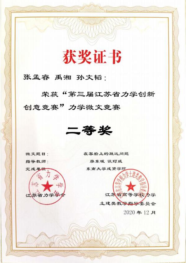 近日,“第三届江苏省力学创新创意竞赛”评审工作落下帷幕。KY开元土木与交通工程学院廖东斌、谈珂威、陈亮三位老师积极组织,精心备赛,在他们的指导下,徐璇、王欧缘两位同学的作品《力与美的碰撞》获力学文化创意竞赛特等奖(第一名),梁竣皆、蒋浩、秦晓欣三位同学的作品《奇妙的反重力水滴》获力学微文竞赛一等奖,李文涛、胡玮、沈伟伟三位同学的作品《不“科学”的科学》以及张孟睿、禹湘、孙文韬同学的作品《在客船上的跳远问题》获力学微文竞赛二等奖。