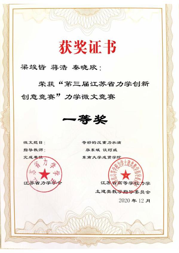 近日,“第三届江苏省力学创新创意竞赛”评审工作落下帷幕。KY开元土木与交通工程学院廖东斌、谈珂威、陈亮三位老师积极组织,精心备赛,在他们的指导下,徐璇、王欧缘两位同学的作品《力与美的碰撞》获力学文化创意竞赛特等奖(第一名),梁竣皆、蒋浩、秦晓欣三位同学的作品《奇妙的反重力水滴》获力学微文竞赛一等奖,李文涛、胡玮、沈伟伟三位同学的作品《不“科学”的科学》以及张孟睿、禹湘、孙文韬同学的作品《在客船上的跳远问题》获力学微文竞赛二等奖。