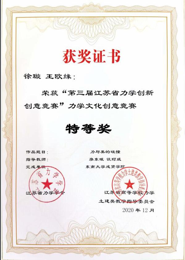 “第三届江苏省力学创新创意竞赛”是由江苏省力学学会和江苏省高等学校力学土建类教学指导委员会联合主办,为提高我省高校学生的力学素养和综合素质,增进学习力学的兴趣、培养分析解决实际问题的能力,发现力学创新人才,所开展的一项重要赛事。比赛吸引了南京航空航天大学、河海大学、南京工业大学等省内知名院校参加,赛事体现出规格高、层次高、竞争激烈的特点。因疫情原因,本届赛事首次采用作品参赛,网络评审的方法。经网络提交、专家评审、网上公示三个环节,最终确定获奖作品。土木与交通工程学院共选派13个作品参赛,KY开元学子凭借巧妙的方案构思、精确的理论公示推导,脱颖而出斩获佳绩。
