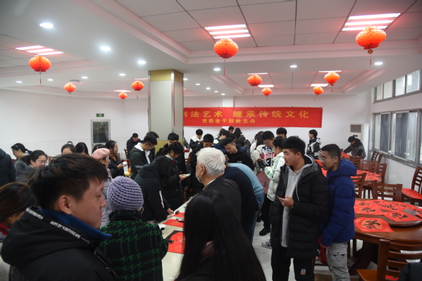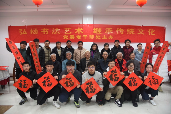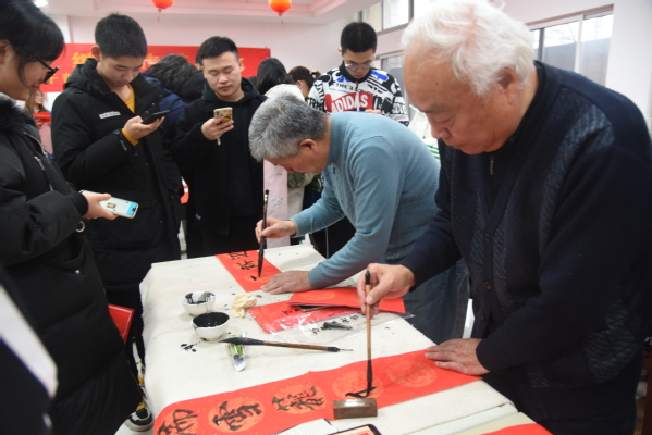 老同志们在现场挥墨泼毫、书写春联,一副副洋溢着喜气的春联跃然纸上,浓浓的情意、真诚的祝福溢于字里行间。除了“福”“寿”和喜庆吉祥的传统春联,师生们还自拟春联,互相交流和祝福,活动现场其乐融融。
