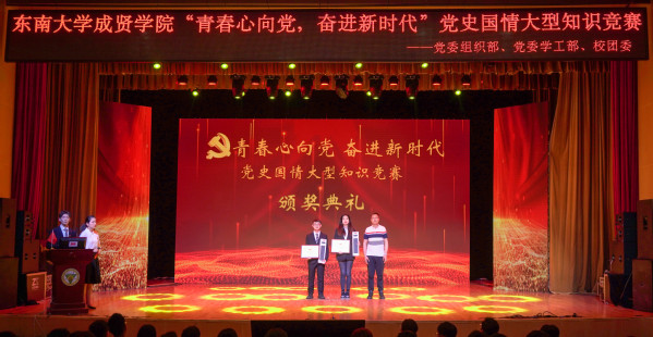 为庆祝中国共产党成立100周年,深入贯彻习近平总书记在党史教育动员大会上的重要讲话精神,落实学校党委关于党史学习教育的决策部署,5月9日晚,由学校党委组织部、党委学工部、校团委联合主办,校学生会学习部承办的“青春心向党,奋进新时代”党史国情知识竞赛在综合楼报告厅举行。党委学工部部长、学生处处长施杰,校团委书记、人武部部长潘明烽,机械与电气工程学院综合办主任李洪全,制药与化学工程学院综合办主任刘静,学院部分分团委书记、辅导员老师与近600名学生代表共同参加了比赛。