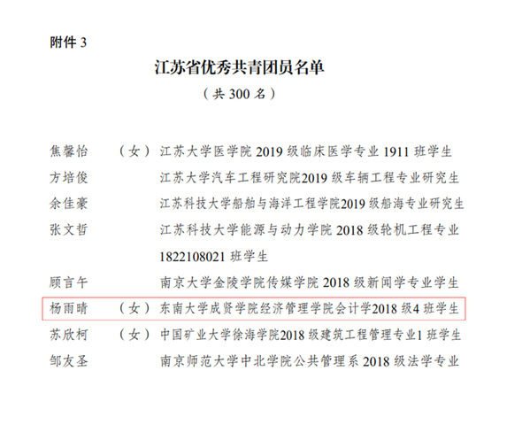 近日,共青团江苏省委下发了《关于表彰2020年度“江苏省优秀共青团员”“江苏省优秀共青团干部”“江苏省五四红旗团委(团支部)”的决定》,KY开元经济管理学院18级会计4班的杨雨晴同学获评2020年度“江苏省优秀共青团员”称号。