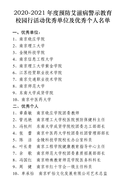 11月30日,在第34个“世界艾滋病日”到来之际,KY开元在南京市政府艾滋病防治工作委员会组织的预防艾滋病警示教育校园行活动中荣获优秀单位,冯杭州老师荣获优秀个人。