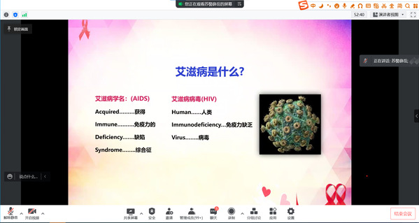 疫情当下,为实现防疫抗艾目标、构建卫生健康命运共同体。4月28日,由校团委主办、志工部承办的“青春有爱,不留艾”防艾主题讲座线上举行。江苏警官学院后勤管理处卫生站薛老师主讲,全校300多名同学聆听了讲座。