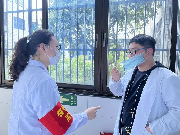 坚定防疫使命,守护校园“疫”线。在校园防疫工作中,学院教工党员切实发挥党组织战斗堡垒和党员先锋模范作用,在课程教学和管理工作之余,下沉基层防疫工作中,积极参与核酸检测扫码和防控监督工作,身穿防护服、肩带红袖章,分工协作、操作娴熟,筑起了校园抗疫的最强防线;学生党员、入党积极分子积极报名宿舍楼防疫志愿者,在督促佩戴口罩、落实防疫要求中发扬志愿服务精神,坚毅的身影出现在校园抗疫工作的最前线。