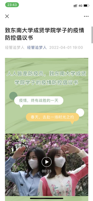 疫情防控宣传与倡导。为落实疫情防控的政策,坚持上下协同、一致抗疫的要求,学院发出倡议宣传书,发布疫情防控知识微信公众号推文,加强疫情防控的宣传与倡导,增强同学们的疫情防控意识和责任感。