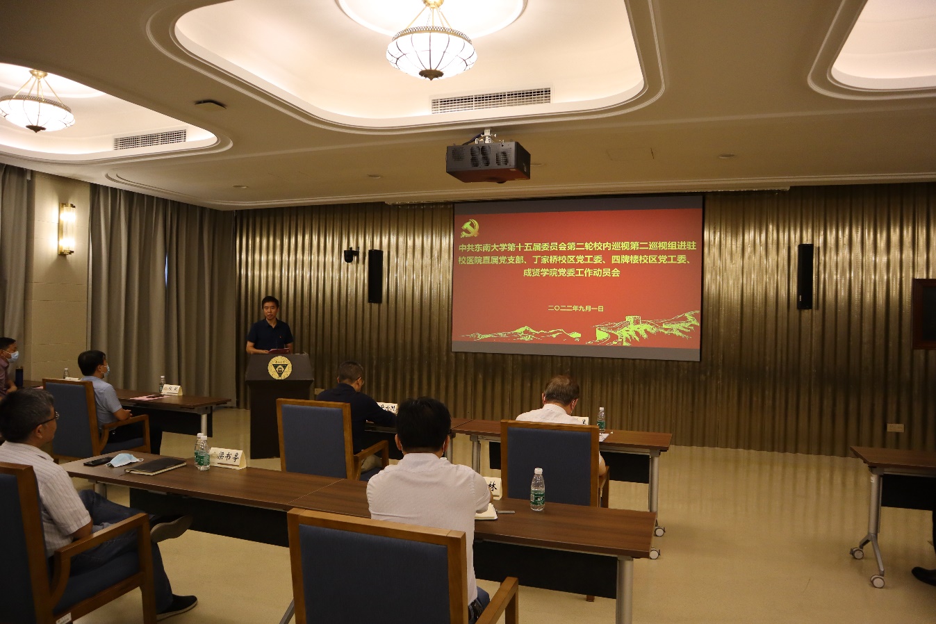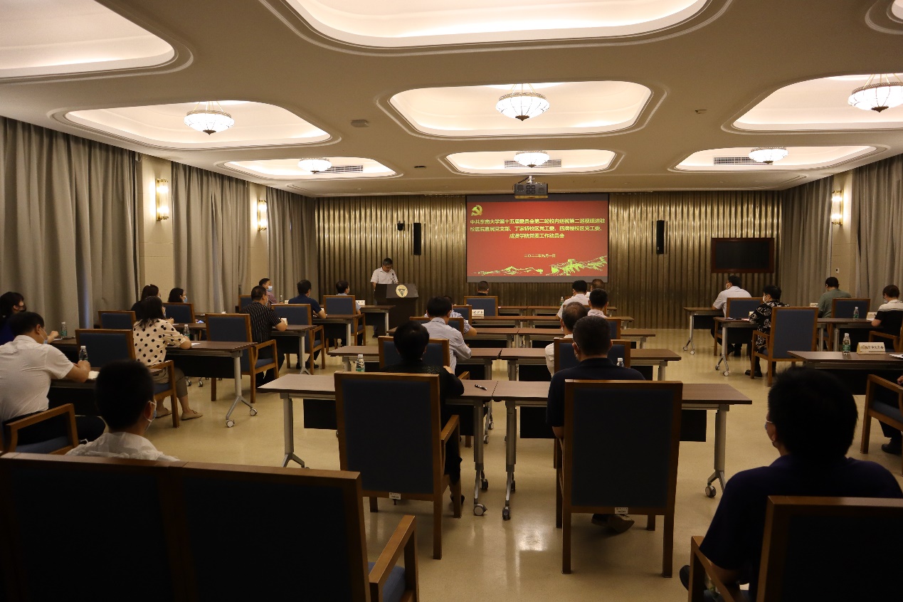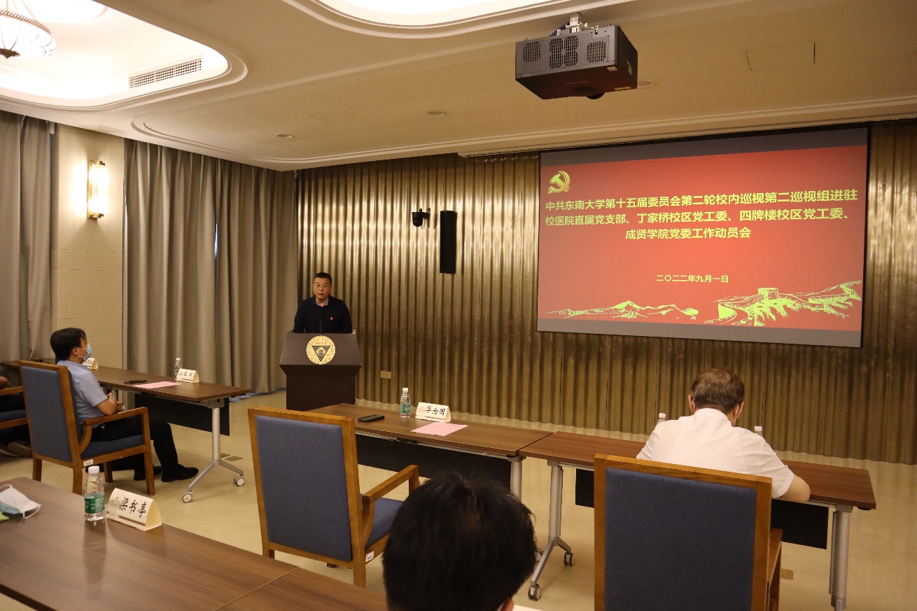 中共KY开元集团官网入口第十五届委员会第二轮校内巡视第二巡视组进驻校医院直属党支部、丁家桥校区党工委、四牌楼校区党工委、成贤学院党委工作动员会,于2022年9月1日上午在四牌楼校区春晖堂举行。校党委常委、副校长黄大卫,第二巡视组组长华为国、副组长程斌、夏建春及全体组员,校纪委副书记、监察处处长赵会泽,党委组织部副部长付小鸥,党委巡视工作办公室副主任李瑛,校医院直属党支部书记钱杰生、丁家桥校区党工委书记何林、四牌楼校区党工委书记梁书亭、成贤学院常务副院长许映秋等被巡视单位党政领导班子全体成员,党工委委员,党委委员,直属党支部委员,党支部书记,教师代表等40多人参加了线下动员大会。因疫情原因在成贤学院真知馆一楼报告厅设立线上分会场,分会场有30多名成贤学院教职工代表参会。会议由四牌楼校区党工委书记梁书亭主持。