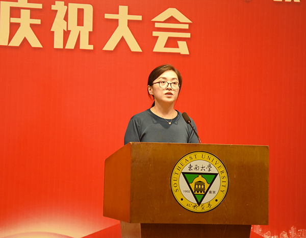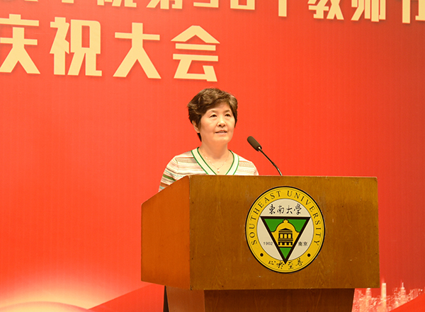 教职工代表土木与交通工程学院的教师陈素芳老师首先代表受表彰教师向各位领导和同事表示最诚挚的感谢和衷心的祝福,对于如何做好立德树人、以生为本的优秀教师她有自己的见解:应做学生为学、为事、为人的师德示范;应打造属于自己的金字课程,把有趣、有味、有劲的课堂目标作为教师的终极追求。