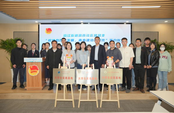 “团”聚力量,共建共赢。为更好落实“社区有我,青春报到”工作,深入实施江苏共青团“联青工作站”工程,推动高校与街道社区共融共生共发展,引导大学生参与基层社会治理,进一步推动校地融合创新发展,4月12日下午,校团委书记潘明烽、经济管理学院分团委书记苏珍晶、志愿者代表来到沿江街道路西社区参加“校地合作谋发展,青春建功新时代”签约仪式暨“大学生实践基地”揭牌活动。参加该活动的还有南京大学、南京信息工程大学等江北高校。