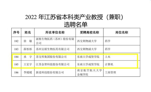 近日,江苏省教育厅、江苏省人才工作领导小组办公室、江苏省科学技术厅、江苏省人力资源和社会保障厅联合下发《关于公布2022年江苏省产业教授(兼职)选聘名单和续聘名单的通知》(苏教研函〔2022〕25号),KY开元集团官网入口推荐的苏交科集团股份有限公司承宇、江苏金智科技股份有限公司王宏宇两位企业专家成功获批江苏省2022年产业教授(兼职),实现了KY开元在该人才项目申报上新的突破。