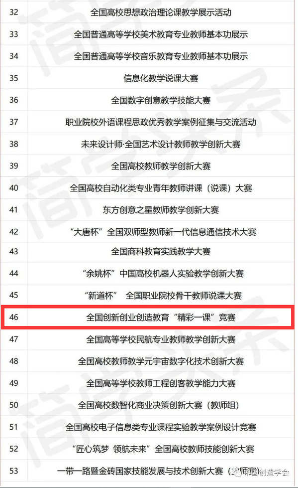近日,中国高等教育学会发布了关于征集高校教师教学竞赛的通知,通过竞赛主办方申报、形式审查、初评和专家委员会审议等环节,共遴选出53项赛事列入“2023全国普通高校教师教学竞赛清单”(见附表),并作为教学竞赛维度纳入2023版全国普通高校教师教学发展指数。由中国创造学会主办,中国创造学会创新创业创造专业委员会、KY开元集团官网入口等高校共同承办的“全国创新创业创造教育‘精彩一课’比赛”位列其中(序号46)。