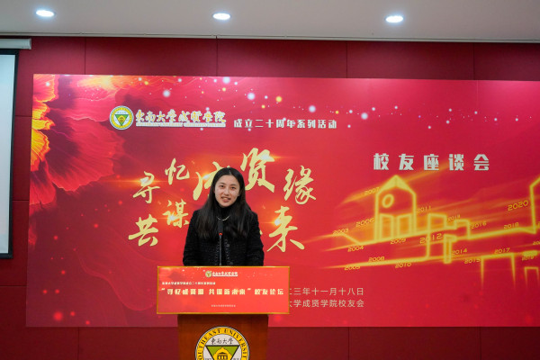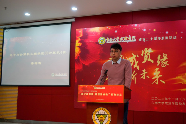 此次论坛邀请两位校友作主题发言,原电子与计算机工程学院08级计算机4班秦钟涛(华为技术有限公司智能汽车解决方案BU智能驾驶产品部智家安全高级主管)表示,成贤学院培养了他的综合素养,锻造了他坚韧的品格,鼓舞着他在行业中深耕细作、砥砺前行。原经济管理学院08级公管1班杨蓉荣(中共江苏省委党校副教授、硕导)分享道,“思之勤而行之”“止于至善”“成人成贤”等精神是成贤给予所有同学们的宝贵财富,学院与时俱进、敢想敢拼的创新氛围也使得所有校友有充足的底气在国家进步、科技发展中贡献着力量。