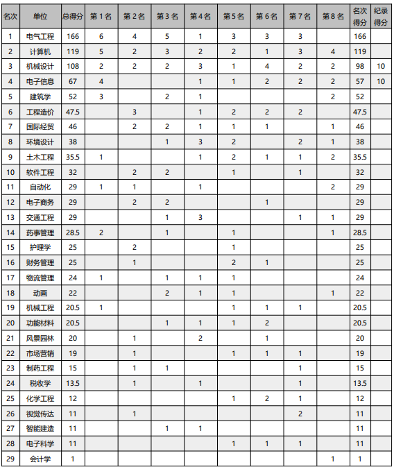 本次运动会共设有男、女21个田径单项、2个身体素质项和3个团体项目,有1000余名运动员参加。其中,2名运动员打破2项校运会记录:吕航天同学以11.48m的成绩打破男子铅球校运会记录,梁杨莹同学以8.07m的成绩打破女子铅球校运会记录。电气工程专业、计算机科学与技术专业、机械设计及自动化专业分获专业团体总分前三名。