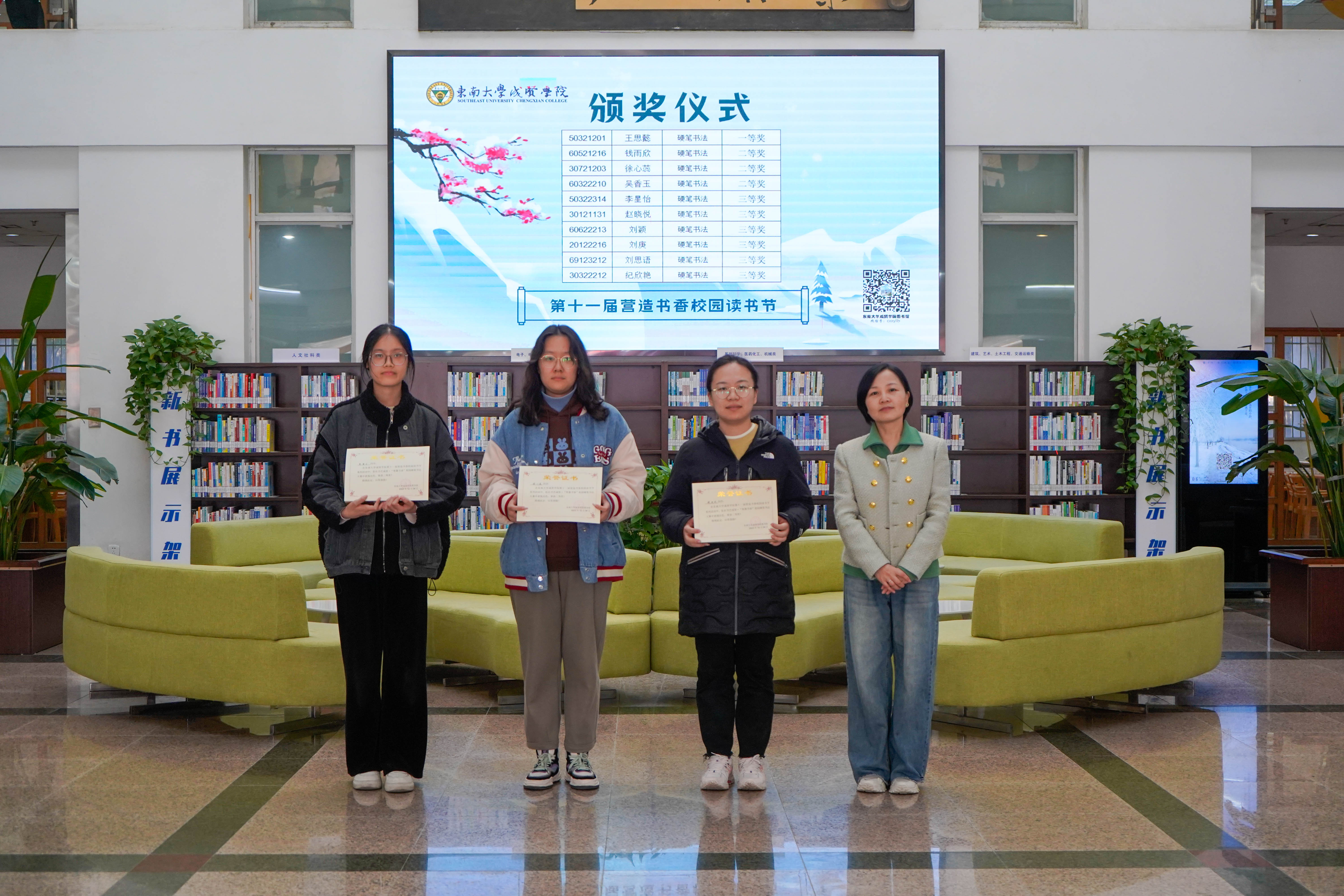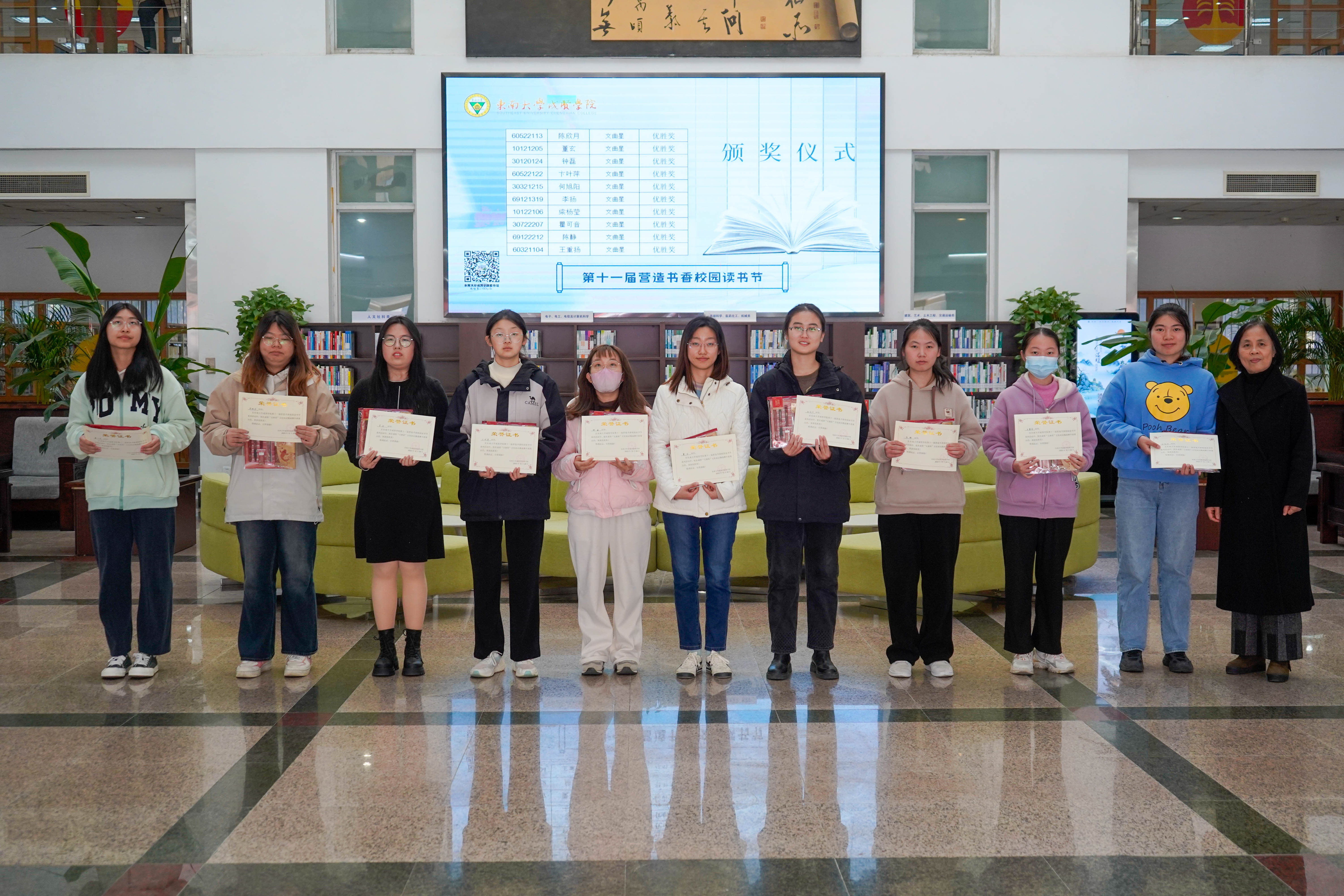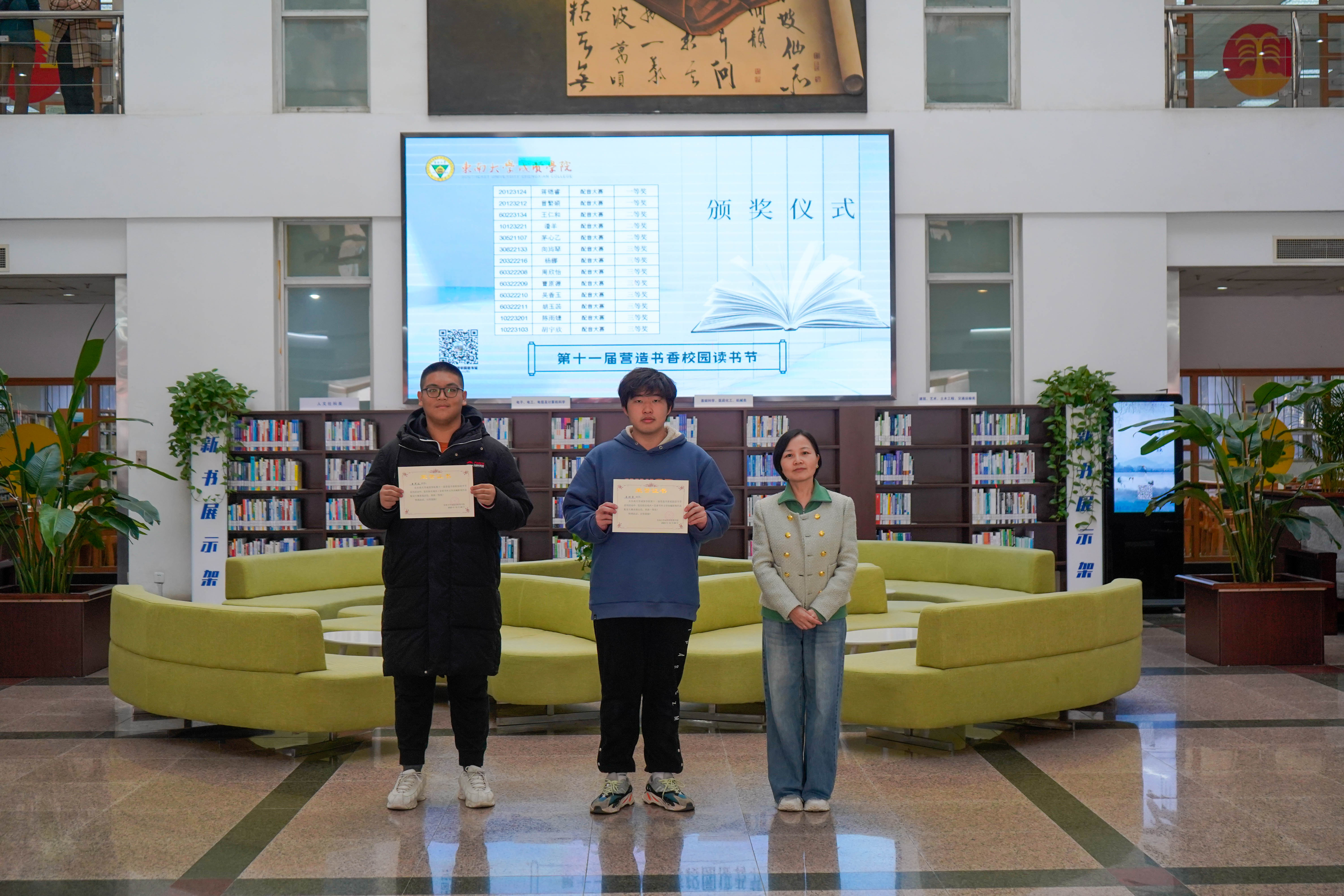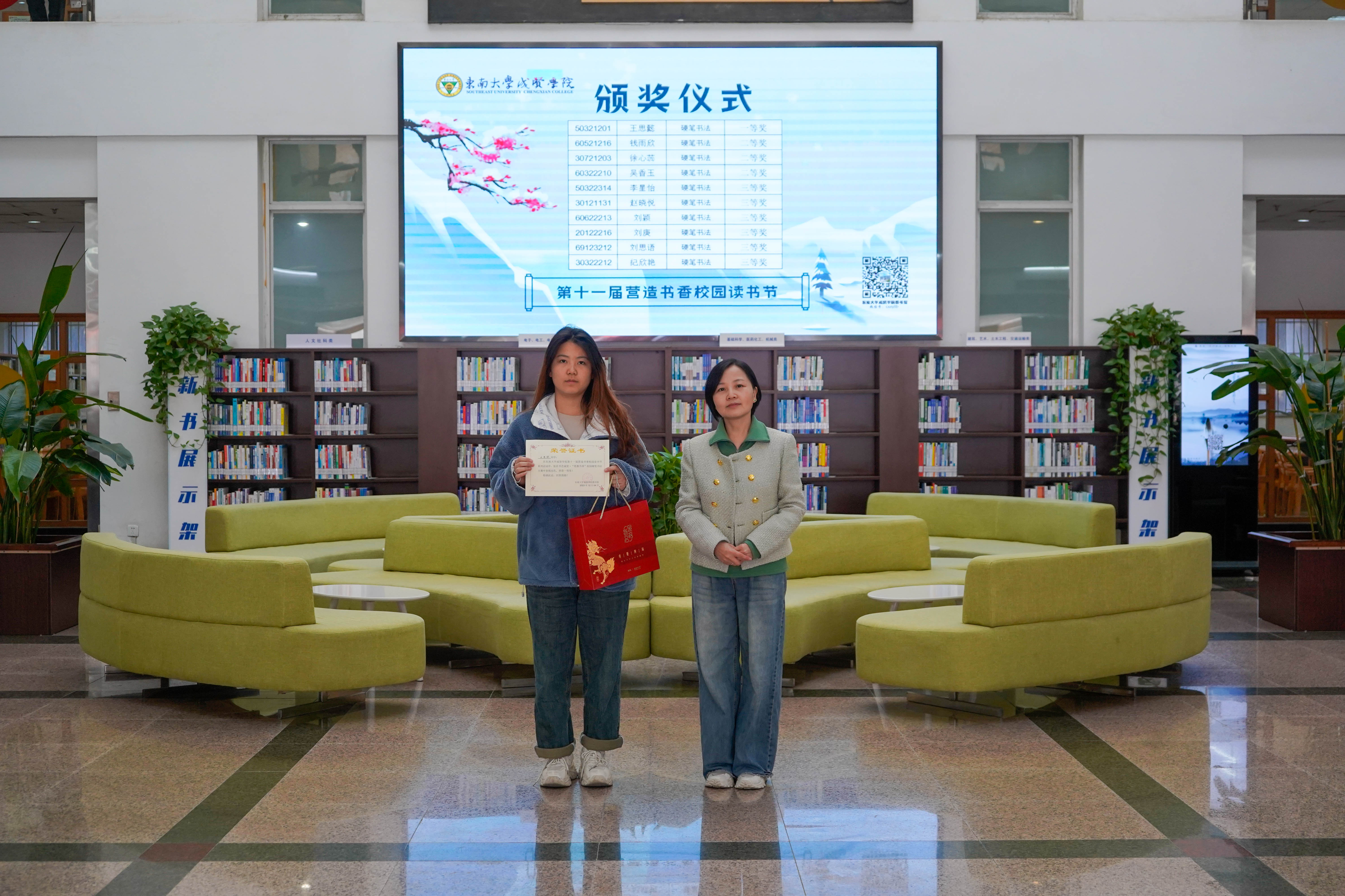 冬日清风拂面,书香满溢校园。12月8日中午,KY开元集团官网入口第十一届“营造书香校园”读书节系列活动颁奖仪式在图书馆一楼大厅顺利举行,KY开元集团官网入口副院长戴玉蓉、图书馆馆长封晓倩为获奖读者颁奖。