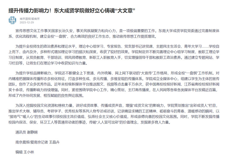 【南京晨报】提升传播力影响力!东大成贤学院做好立心铸魂“大文章”