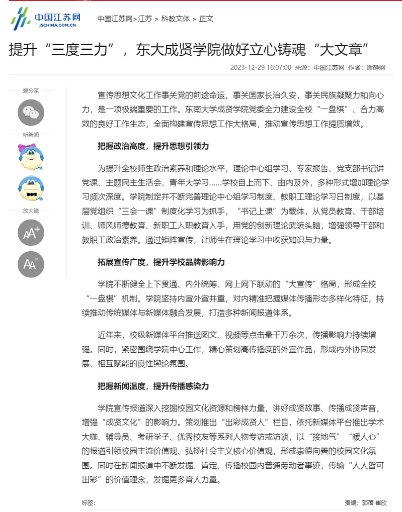 【中国江苏网】提升“三度三力”,东大成贤学院做好立心铸魂“大文章”