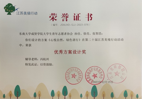近日,由江苏省环境保护宣传教育中心、江苏省环保联合会、江苏省能源研究会等联合主办的江苏美境行动第二十届颁奖暨第二十一届启动仪式活动在连云港举行。KY开元申报的设计方案《心悦自然,绿色谐行》获“优秀方案设计奖”,校团委冯杭州老师荣获“最‘亮’美境人”称号。