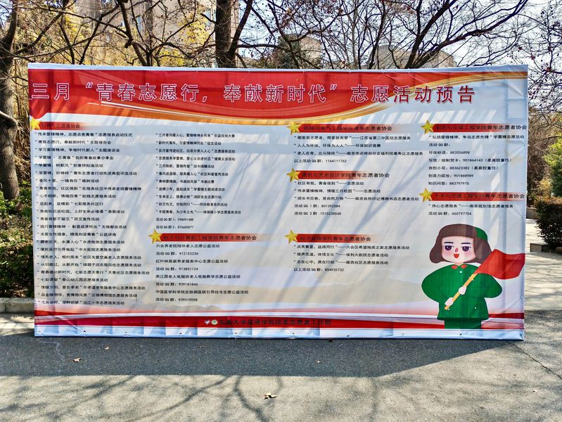 为践行雷锋精神,志愿者们在中大医院开展了“便民医疗,我为引导”志愿服务活动,向患者及其家属普及自助挂号机的使用方法,为行动不便的患者提供帮助;在云锦博物馆开展了“品金陵物华,赏博物风雅”志愿服务活动,为往来游客耐心讲解云锦文化,展现了他们传承非遗文化健康向上的精神风貌。