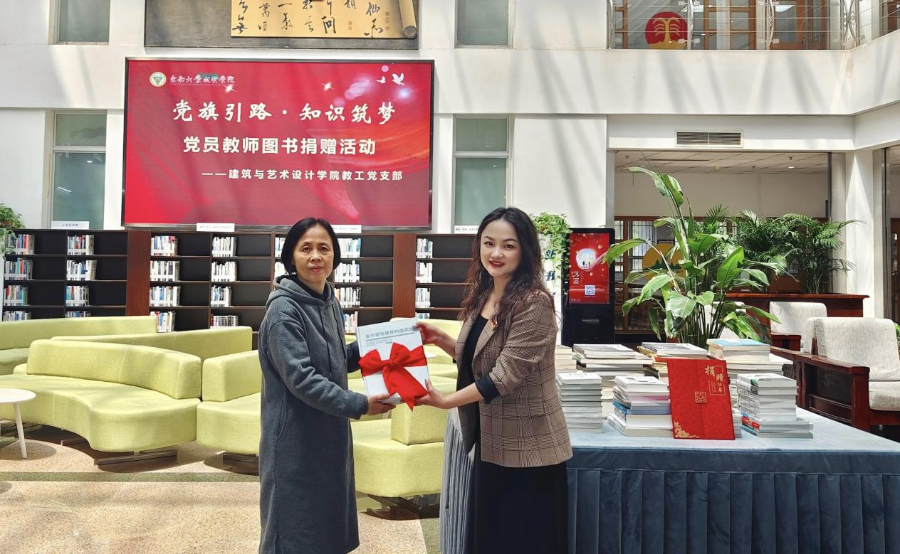 建筑与艺术设计学院教工党支部书记王桉代表支部党员教师捐赠图书,图书馆馆长封晓倩代表校图书馆接收赠书。