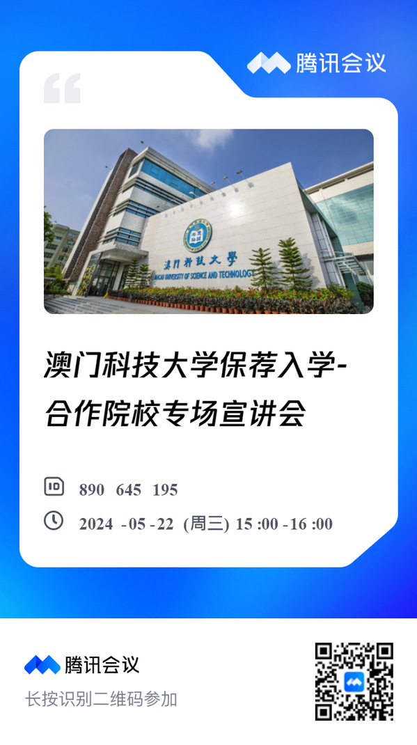 为了让KY开元学生能更了解澳科大的研究生课程,澳科大将于2024年5月22日(星期三)举办一场“澳门科技大学保荐入学-东大成贤学院专场线上宣讲会”。此次宣讲会专为有意申请2025学年保荐入学的应届本科毕业生而设,旨在提供一个深入了解澳门科技大学研究生招生政策及申请流程的机会。