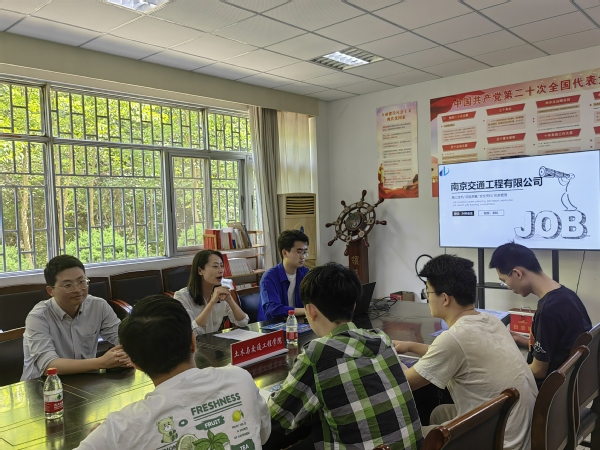 5月15日上午,由校友会牵头,土木与交通工程学院在物理实验楼124会议室举办南京交通工程有限公司专场招聘会。学生处处长助理、校友会办公室主任颜秉明,土木与交通工程学院院长助理、综合办主任石城,毕业班辅导员陆凡华、张玲热情接待用人单位的领导,2020级毕业班同学参加了此次招聘会。