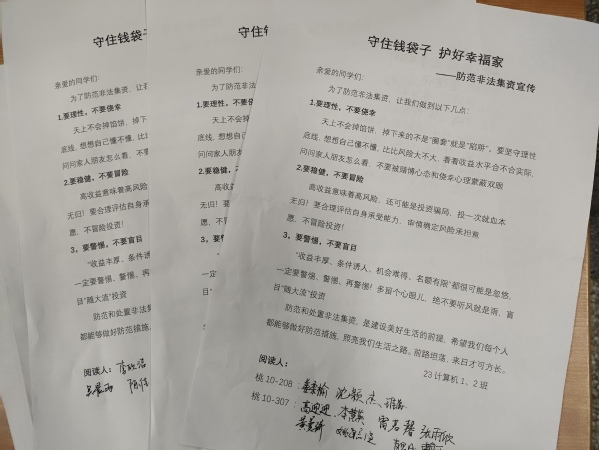 本次宣传月活动,电子与计算机工程学院主要通过开展“防范非法集资,守护好自己钱袋子”主题班会教育活动,观看防范非法集资公益宣传片,学习《防范和处置非法集资条例》,签订“守住钱袋子,护好幸福家——防范非法集资共建文明校园倡议书,开展“守住钱袋子·护好幸福家”防范非法集资短视频征集大赛等形式,向同学们普及了防范非法集资知识,认识非法集资组织开展的形式和手段,以及如何防范非法集资。通过活动开展,同学们认识到“一夜暴富是陷阱,天上不会掉馅饼”、“守护好自己的钱袋子,就是守护自己的学业和家人的幸福”,增强了防范非法集资的意识。