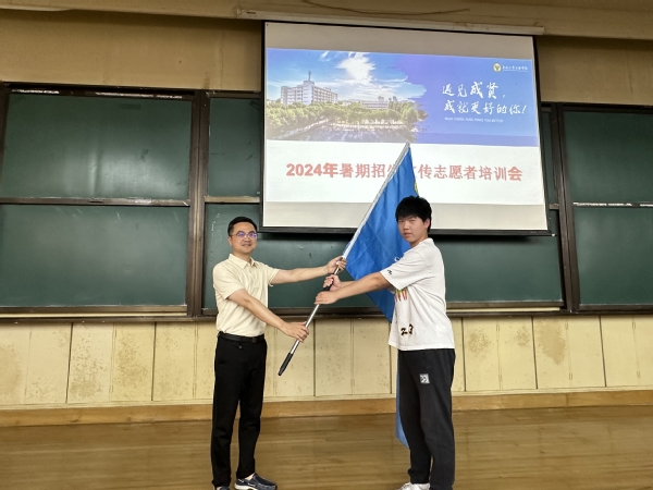 培训会举行了庄重的授旗仪式,学生处副处长苏力授予“招生志愿者社会实践团队”队旗。