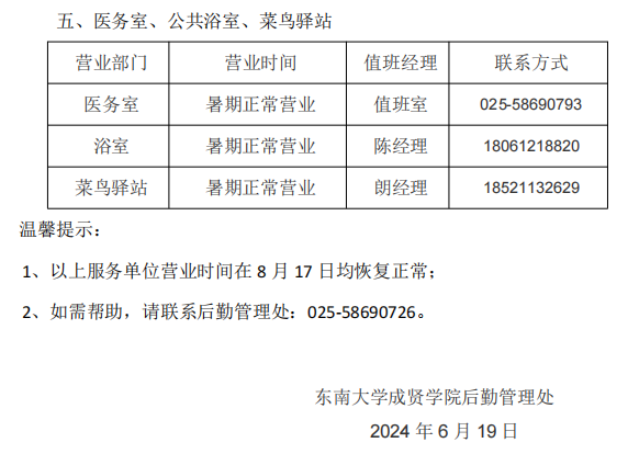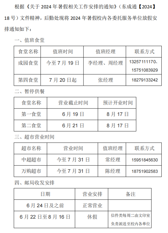 关于2024年暑期校内各委托服务单位营业时间调整的通知