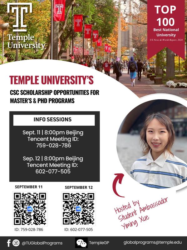本次线上宣讲会主要内容有CSC奖学金所涵盖的天普大学硕士研究生及博士生专业、招生过程、专业发展机会、学生生活和资源以及CSC奖学金申请细节等。请有志出国深造的同学聆听线上宣讲会,具体腾讯会议时间及ID号码如下: