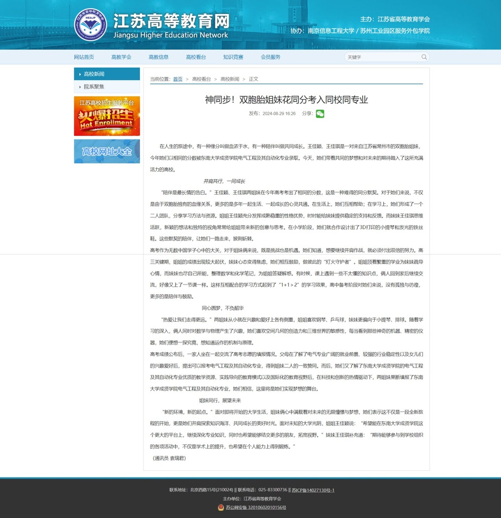 【江苏高等教育网】神同步!双胞胎姐妹花同分考入同校同专业