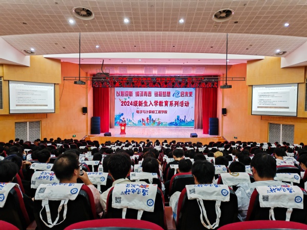 为引导2024级新生全面认识大学、实现角色转换、激发成才动力,电子与计算机工程学院聚焦新生群体特点、把握关键节点、结合专业特色、坚持深耕细作、凝聚育人合力,扎实开展新生入学系列教育活动。9月27日晚,电子与计算机工程学院在综合楼报告厅举办“以心迎新,编译青春,链接梦想,e启未来”新生入学教育系列活动启动仪式,为全院新生顺利开启大学生活奠定良好基础。学院执行院长王晓蔚、党总支副书记羊栋、副院长朱林、新生辅导员、新生班导和全体新生参加了活动,启动仪式由综合办主任冯杭州主持。