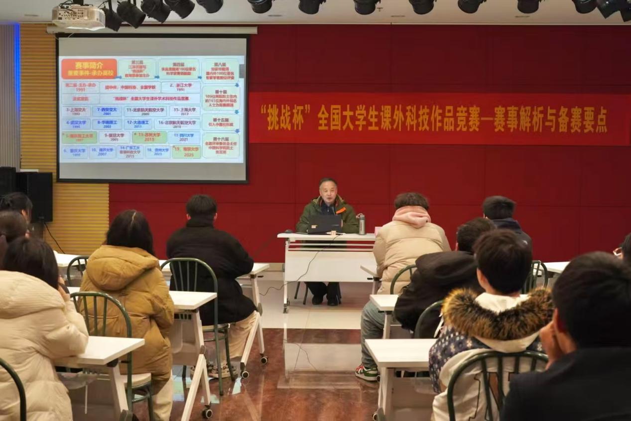 林岭教授首先介绍了“挑战杯”的参赛资格与作品申报、作品类别领域、作品、评审标准、共性因素、分类要点等进行了讲解,并介绍了如“揭榜挂帅”专项赛、“黑科技”专项赛和红色专项活动等的多个专项赛和专项活动,强调了“五步走”项目选择原则和三个项目突破要点,使同学们更加深入地了解了“挑战杯”作品的立意、选题、价值与操作细节,更引导同学们突破固有思维,不断孕育调整,以打造出更具创新性、挑战性、成熟性的“挑战杯”作品。