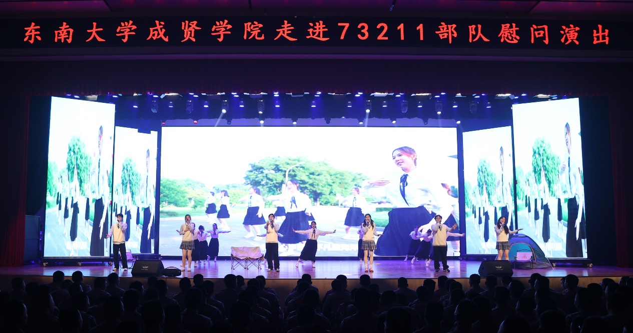 慰问演出在开场舞《Ei Ei》的青春活力中拉开序幕。歌曲串烧《雾里看花》《不要怕》《没有黄河我活不下去》《向云端》《稻香》或婉转悠长或深刻洪亮;舞蹈《梨花颂》《探清水河》柔美婀娜;《南京恋爱通告》甜蜜表白南京;《明月引》以器乐合奏书写一首充满诗意与画意的民乐佳作;舞蹈《飞天》《橘颂》以舞蹈跨越千年惊艳亮相;说唱《飘向北方》充满青春力量,振奋人心;小品《超时空重逢》演员深情演绎跨时空地重逢,致敬军人;歌舞《青春就这young》、现代舞串烧《Jenny from the block》《IMMAGETIT》充满青春活力;舞蹈《咏春》一招一式,刚劲有力,演出在歌舞《爱达未来》中落下帷幕。晚会中通过军训视频回顾了今年73211部队承训教官带训彰显着青春热血的军训时光。整场演出高潮迭起,精彩绝伦,涵盖了歌唱、舞蹈、器乐演奏、戏曲舞蹈及话剧等多种艺术表演形式,成贤学子的精神风貌和艺术展现,深情表达了学校对部队的感谢。