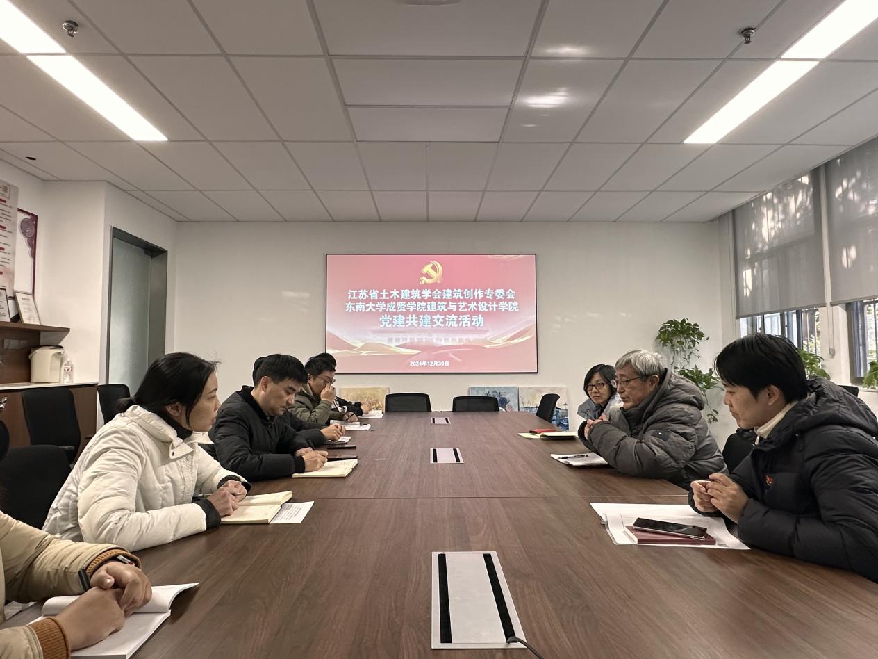 交流会上,邵叶鑫副书记对江苏省土木建筑学会建筑创作专业委员会党建工作小组到建筑与艺术设计学院开展党建共建表示热烈欢迎,感谢专委会党建共建交流活动助力学院专业创新发展,同时介绍了学院党总支基本情况、校地校企党建工作特色、党建引领与专业建设和人才培养成效等。胡振宇教授详细介绍了江苏省土木建筑学会建筑创作专业委员会的发展历程、组织结构、职能活动、成就影响等,重点阐述了党建工作在专业委员会发展中的关键作用。他指出专委会将给予学院进一步支持,同时鼓励学院师生积极参加专委会举办的各项学术活动,不断推动专业建设迈向新高度。