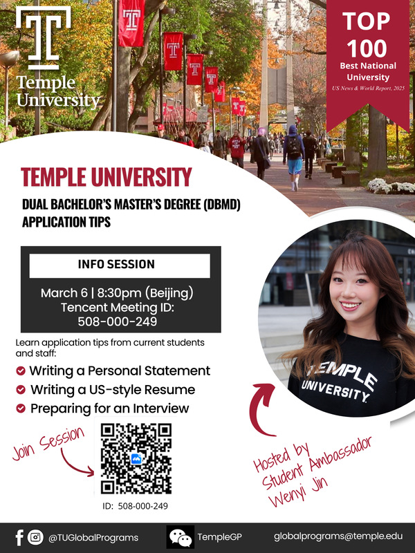 为了进一步了解美国天普大学DBMD项目的详细内容、专业设置、申请条件、校园生活及费用等信息,并分享如何撰写申请研究生学院书面陈述、如何写出美国风格的个人简历以及如何准备面试等方面的技巧,天普大学将面向协议学校开展DBMD项目线上宣讲会,具体参会时间及方式如下: