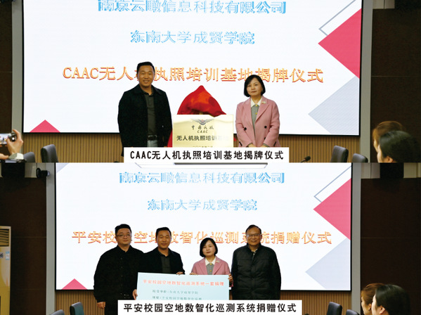 戴玉蓉副院长首先代表学校对林华桂总经理一行的来访表示热烈的欢迎。戴玉蓉副院长在致辞中表示,此次合作是学校深化应用型人才培养模式改革的重要举措。通过整合企业技术资源与高校教育优势,构建“理论+实践+认证”一体化培养体系,为低空经济领域输送高素质、专业化人才,同时也为KY开元创建全国一流应用型大学、培养一流应用型人才增添新的亮点。土木与交通工程学院郭正兴院长在发言中指出,无人机执照培训基地的成立,是响应国家低空经济政策、服务区域产业升级的关键布局。未来,土木与交通工程学院将牵头与兄弟院系一起联合企业开发行业定制课程,开展技术攻关,助力无人机在道路巡检、电力巡检等场景的规模化应用。林华桂总经理对KY开元领导的热情接待表示衷心的感谢,他在发言中提到,无人机技术正广泛应用于测绘、物流、应急管理、平安校园建设等领域,但行业亟需具备执照资质和实战能力的复合型人才。此次校企共建培训基地,不仅能为学生提供CAAC认证培训,还将引入企业真实项目,实现人才培养与产业需求无缝对接。随后,双方领导共同为“CAAC无人机执照培训基地”揭牌,南京云瞰信息科技有限公司向KY开元捐赠“平安校园空地数智化巡测系统”一套,助力KY开元平安校园建设。